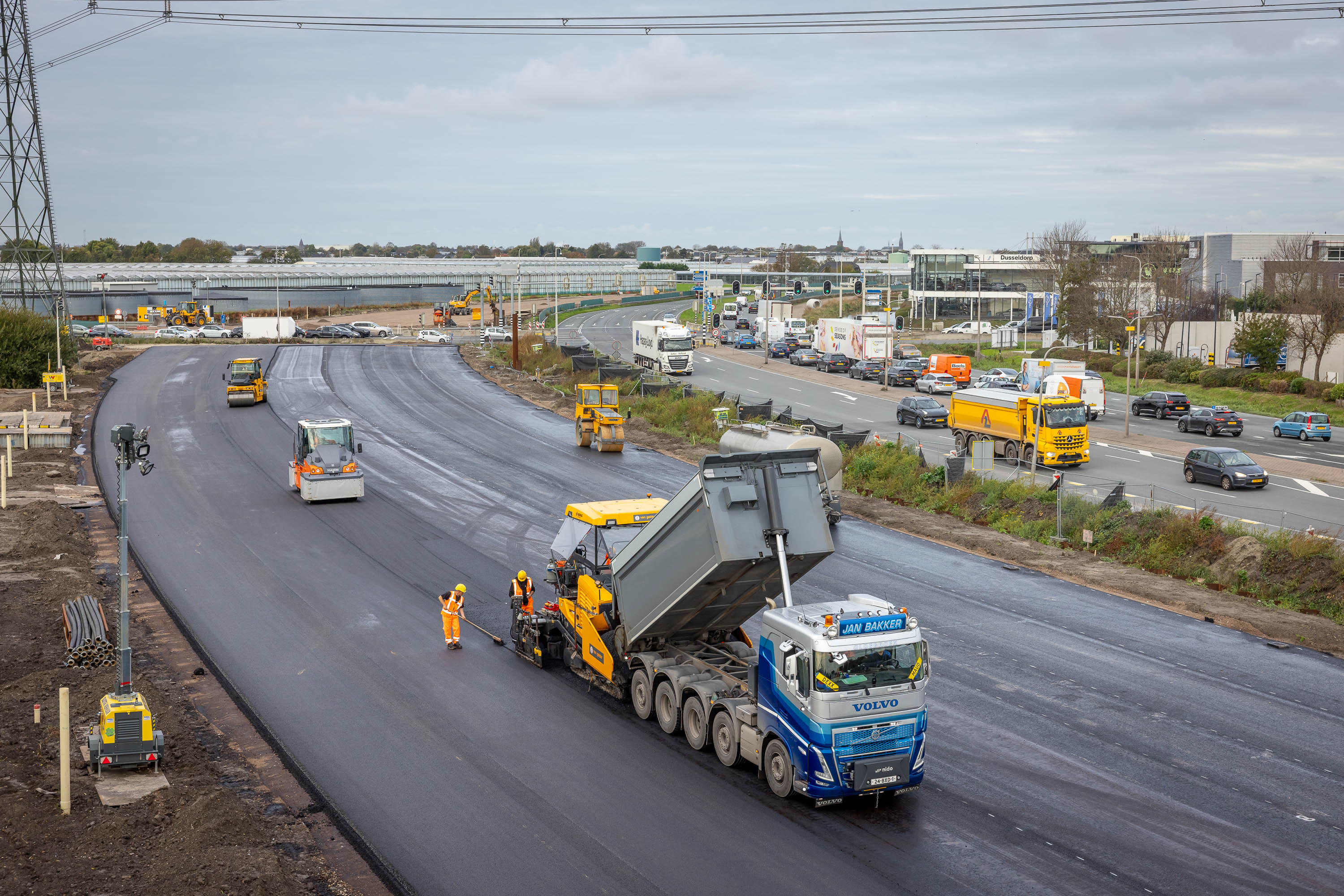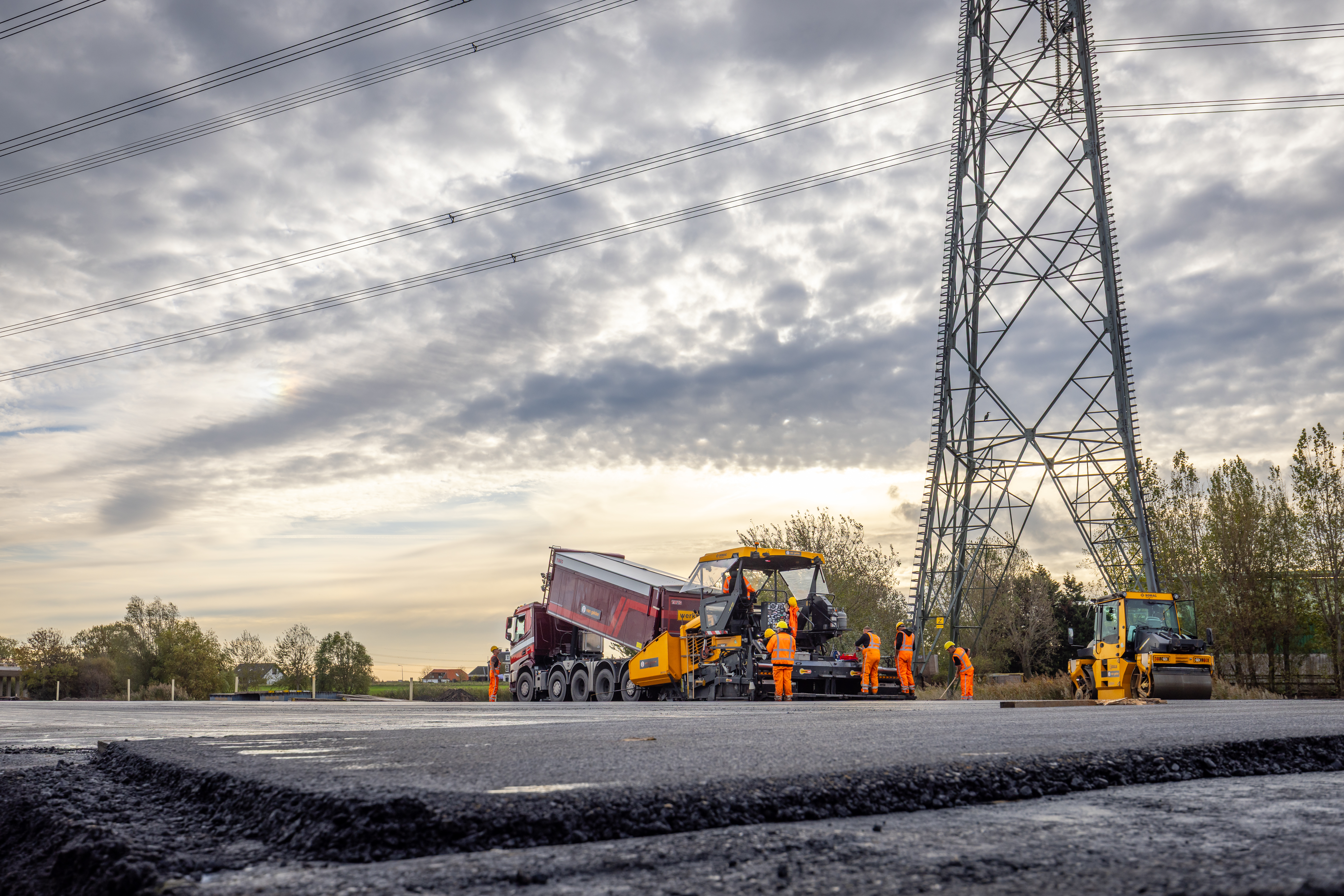 Direct na het aanbrengen zorgen walsen ervoor dat het asfalt optimaal wordt verdicht.