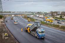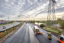 Geïsoleerde vrachtwagens brengen asfalt naar het werk om het hier met circa 150 graden te verwerken.