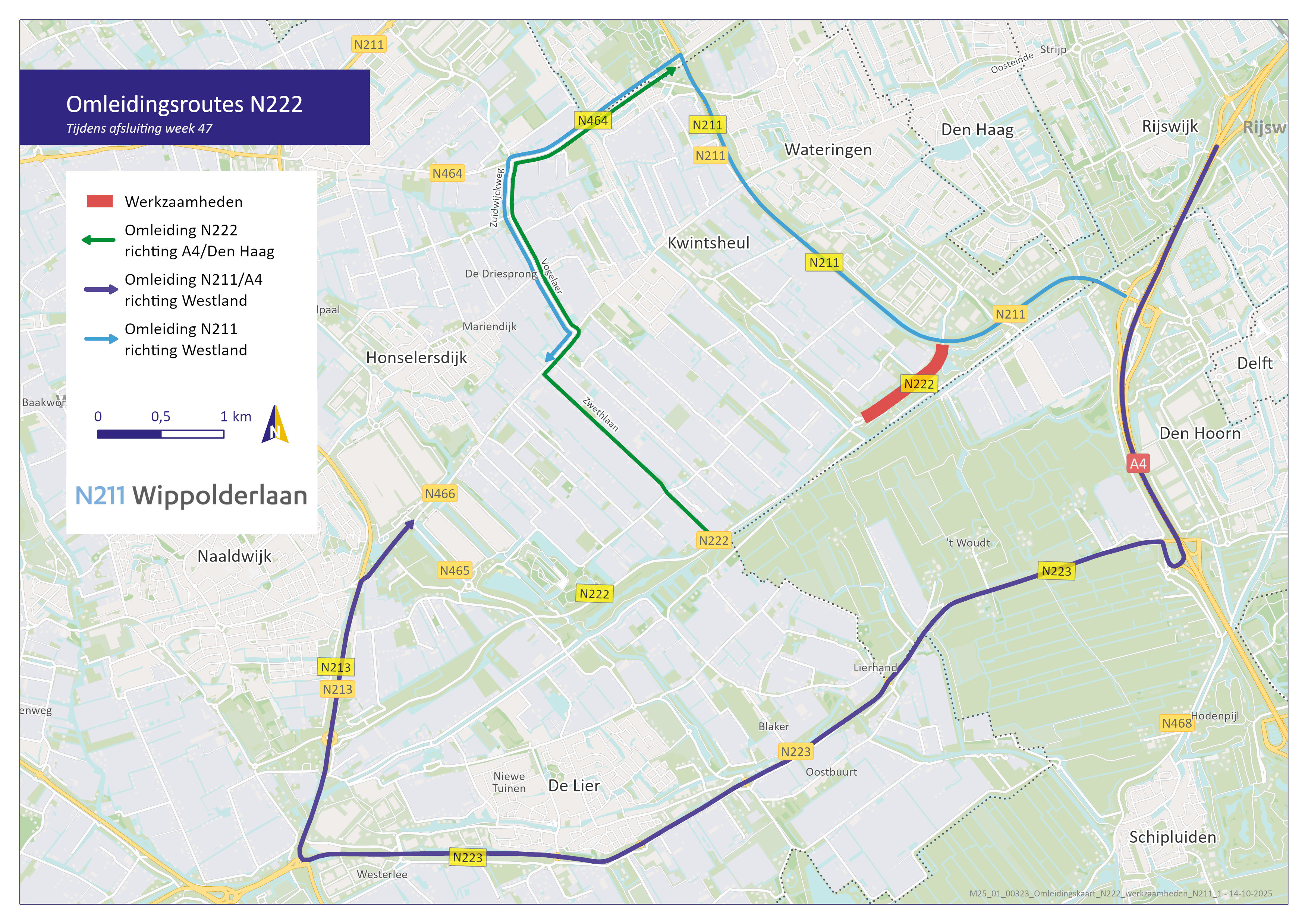 - Maandag 17 november 04.00 uur – vrijdag 21 november 22.00 uur: N222 (Westlandroute) afgesloten, N211 Wippolderlaan open.
