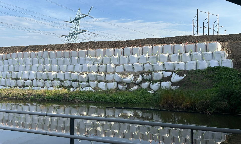 Op de plek waar de nieuwe rijbanen straks komen brengen wij nu verzwaring aan met behulp van tonnen zand. Het voorbelasten is nodig om ervoor te zorgen dat de grond sterk genoeg wordt voor het verkeer dat er later overheen rijdt.