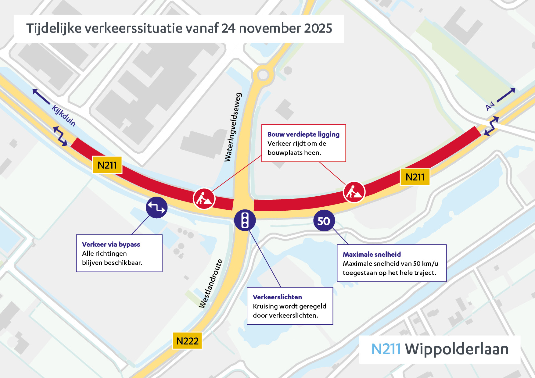 Van vrijdag 14 november tot en met maandag 24 november moet je rekening houden met flinke vertraging. We werken meermaals aan de N211 Wippolderlaan en de N222 (Westlandroute).
